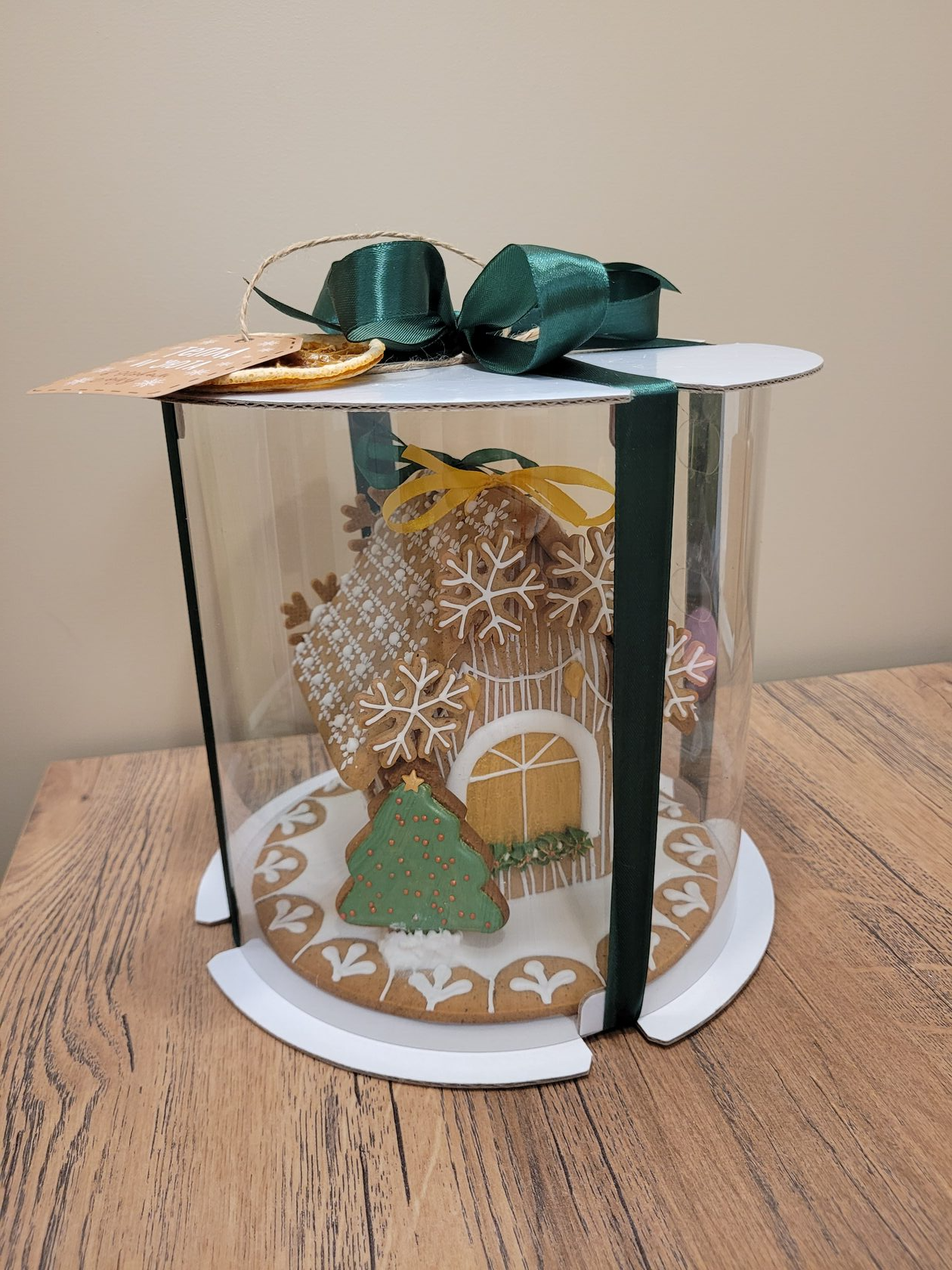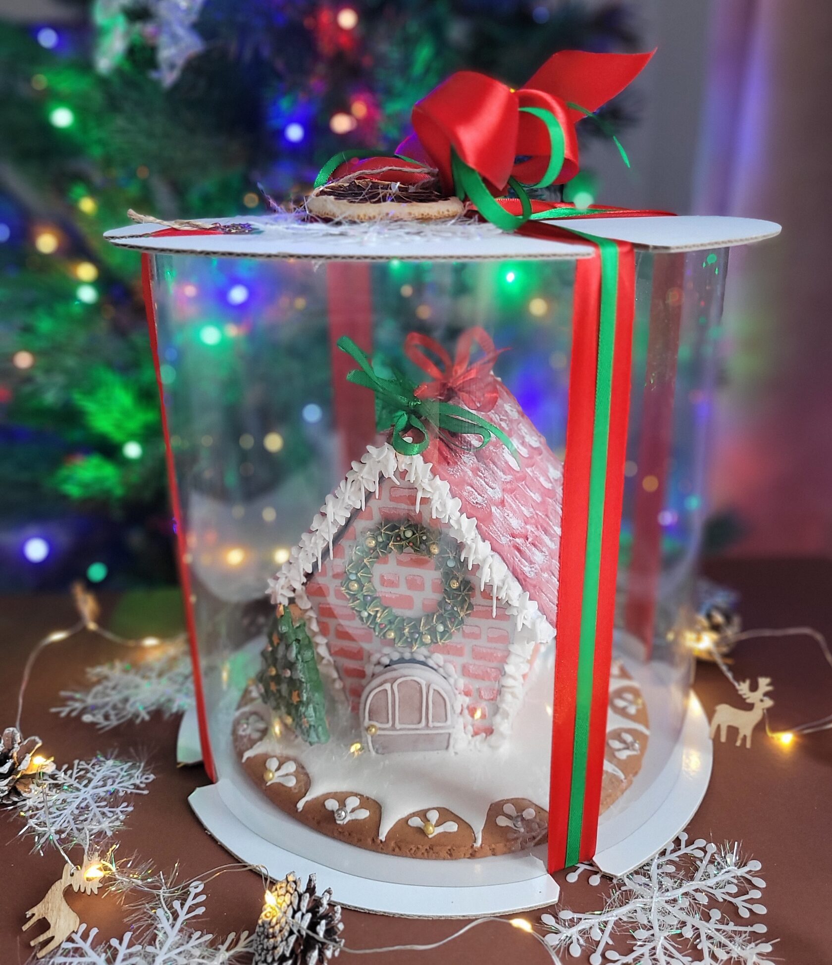 Упакован в прозрачную круглую коробку с новогодним декором.